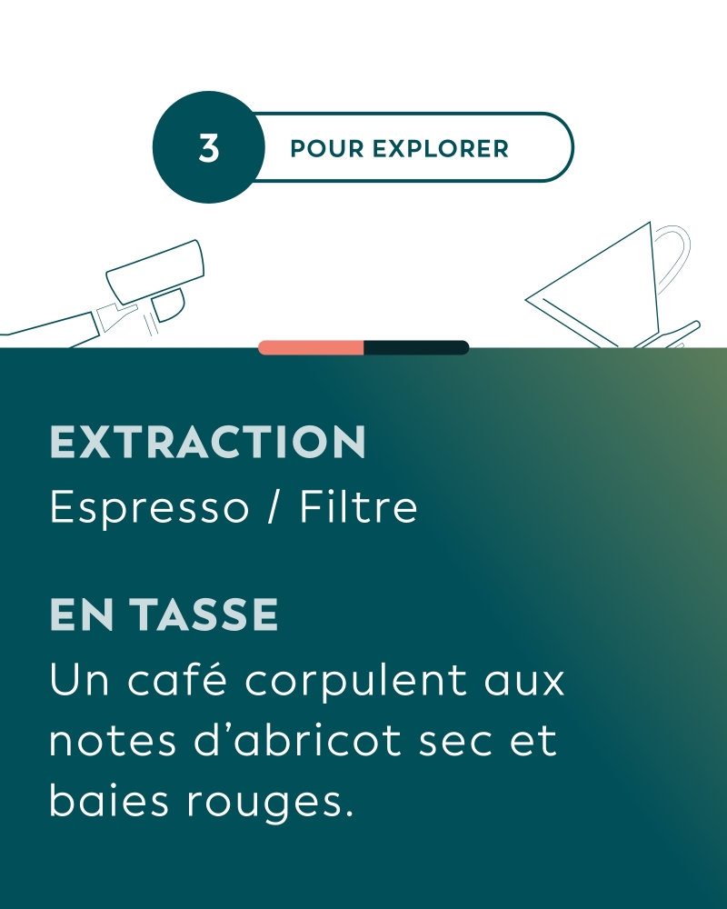 Un café corpulent aux notes d’abricot sec et baies rouges.