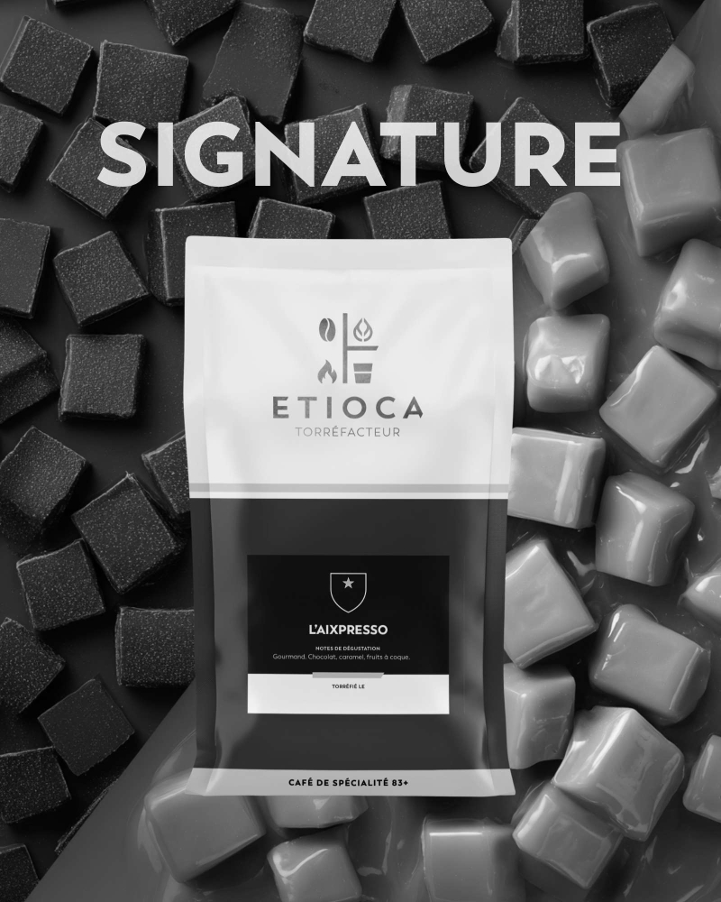L’Aixpresso est, en quelque sorte, notre café signature. Il vous offre une belle base de café dédiée à l’espresso, en machine manuelle ou automatique. Chez Etioca, nos cafés évoluent toute l’année mais pas l’Aixpresso. En effet, c’est un café où vous retrouverez toujours le même profil aromatique, axé sur des notes gourmandes de chocolat, caramel et fruits à coque. L’origine et le contenu évoluent pour garder nos valeurs de saisonnalité, mais pas son goût pour vous permettre d’apprécier votre café toute l’année !