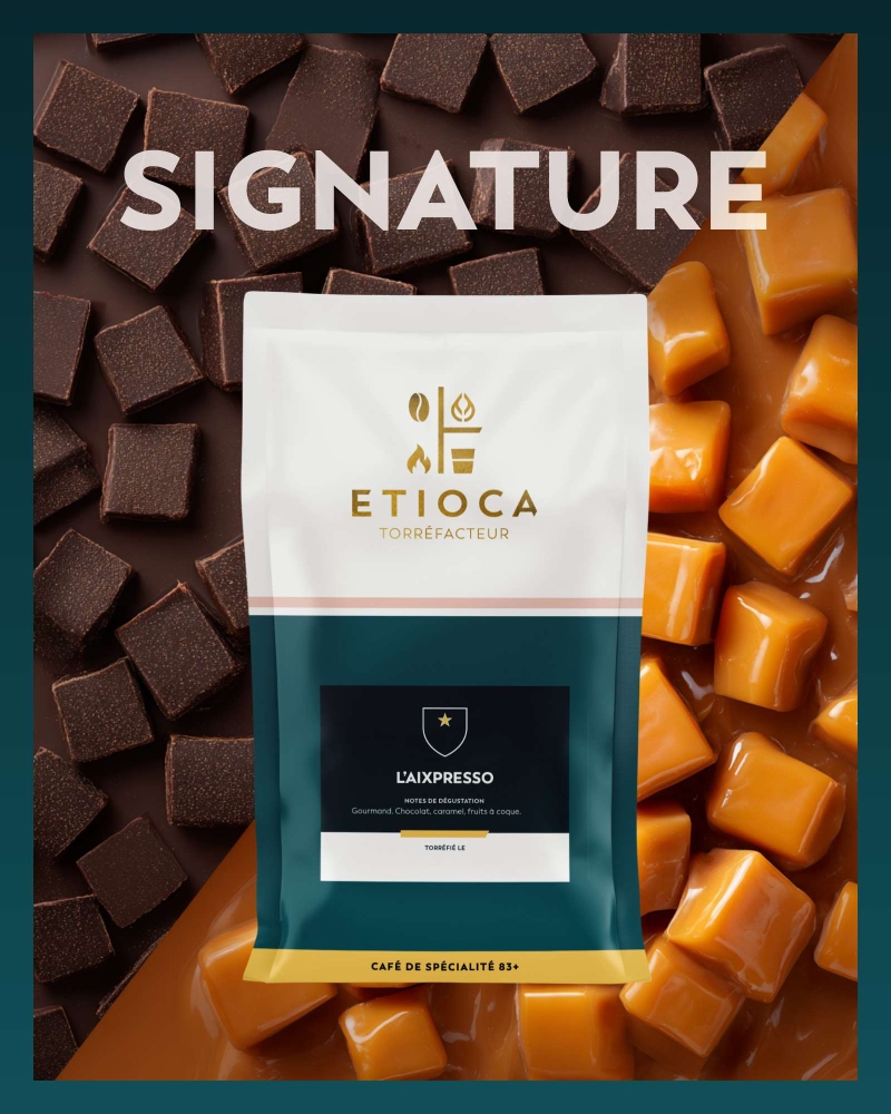 L’Aixpresso est, en quelque sorte, notre café signature. Il vous offre une belle base de café dédiée à l’espresso, en machine manuelle ou automatique. Chez Etioca, nos cafés évoluent toute l’année mais pas l’Aixpresso. En effet, c’est un café où vous retrouverez toujours le même profil aromatique, axé sur des notes gourmandes de chocolat, caramel et fruits à coque. L’origine et le contenu évoluent pour garder nos valeurs de saisonnalité, mais pas son goût pour vous permettre d’apprécier votre café toute l’année !