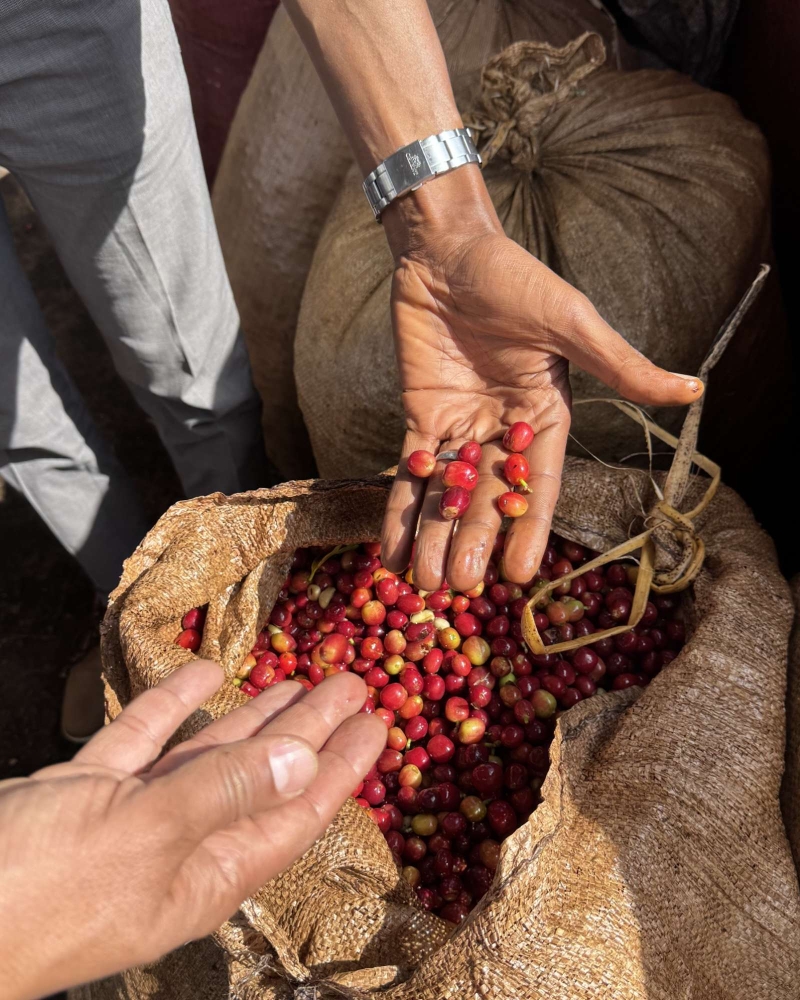 Située à 2 300 m d’altitude, la station Hambela Goro travaille avec 460 petits producteurs de la variété 74110. À sa tête, Tagel Alamayehu, fondateur de la société Olkai, incarne une nouvelle génération engagée. Après avoir racheté les terres perdues par son père, figure historique du café à Guji, il fonde Olkai en 2018 avec une vision claire : produire des cafés d’exception tout en soutenant les communautés locales. Les producteurs sont mieux rémunérés, reçoivent des plants chaque année et bénéficient de projets éducatifs. Ce café lavé, fermenté 48 h puis séché sur lits africains, reflète cette rigueur et cet engagement durable.